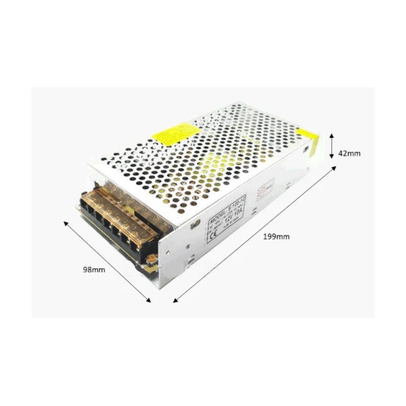 منبع تغذیه سوئیچینگ 12V-10A دارای ورودی ولتاژ 110 ولت الی 220 ولت است. فرکانس ورودی در این پاور سوئیچینگ برابر 50 الی 60 هرتز میباشد. ولتاژ خروجی این پاور ساپلای برابر 12 ولت و جریان خروجی آن 10 آمپر است